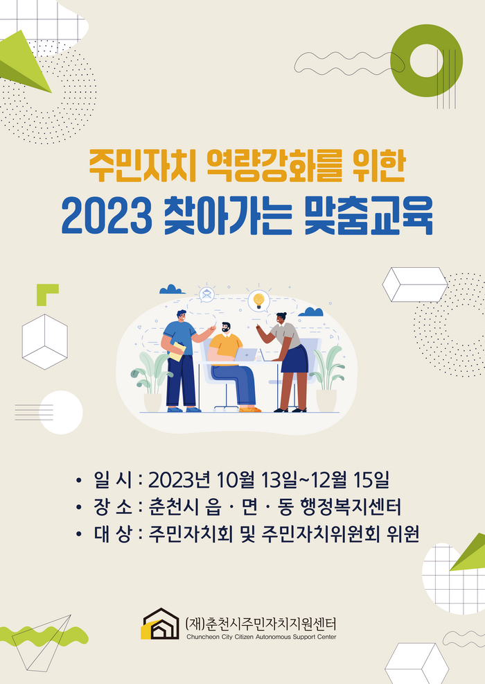 ‘2023 찾아가는 맞춤 교육’은 주민자치회의 활동성을 강화하려는 목적으로 주민자치교육, 갈등관리교육, 우수사례교육, 환경사랑교육 등 사고의 폭을 넓힐 수 있는 다양한 주제의 교육으로 구성되었으며, 각 주민자치회별로 필요한 교육을 선택할 수 있도록 사전 신청을 받았다.