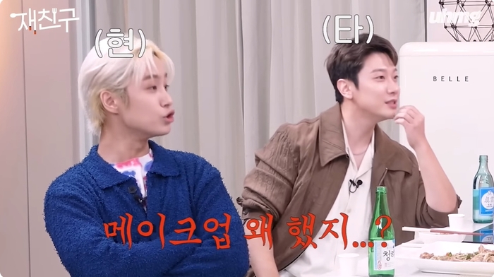 ‘친 FNC’라는 김재중에 대해 이홍기는 “재중이 형이 우리 대표님들이랑 다 친하다”라며 급히 한 잔을 따라주는 모습을 보였다. 제작진은 “무슨 회식 같다”라며 웃었다.