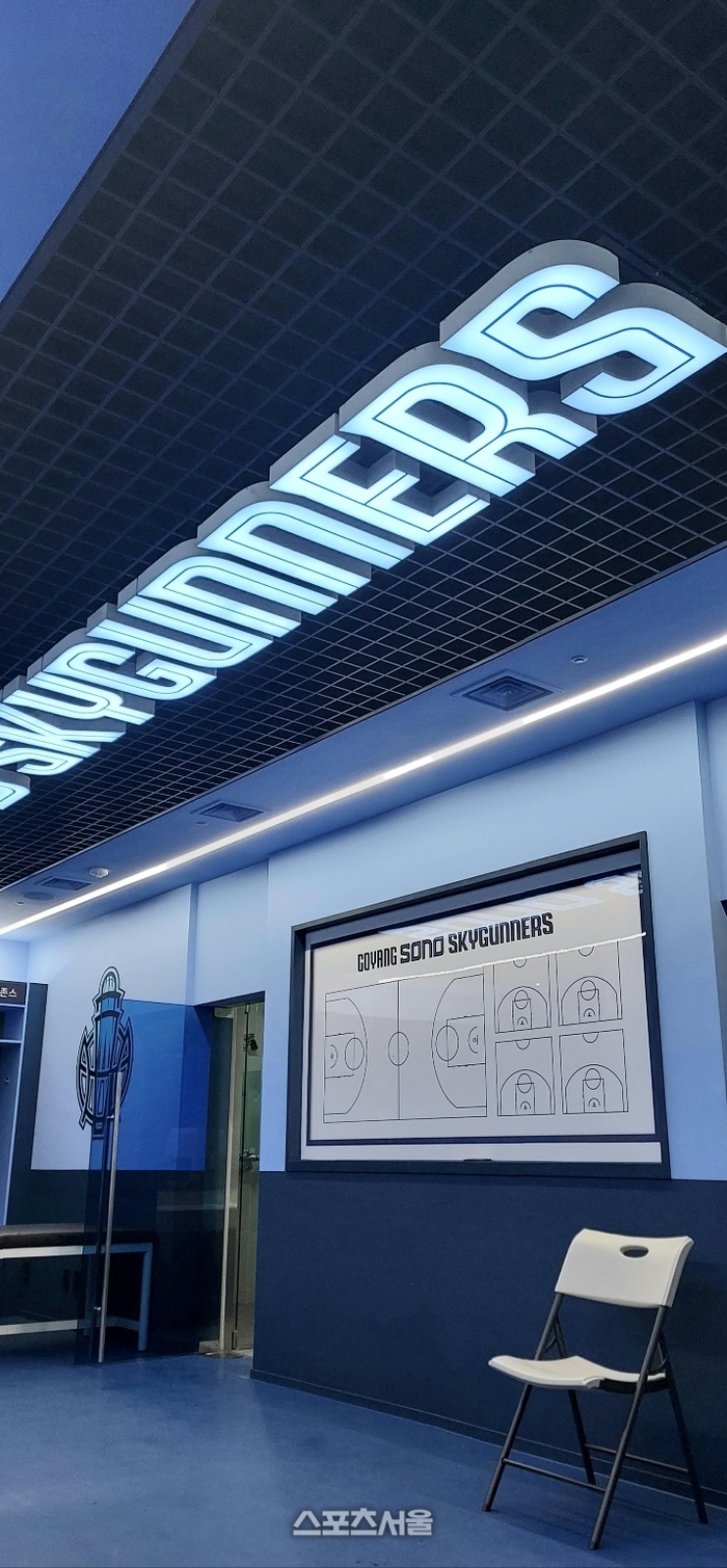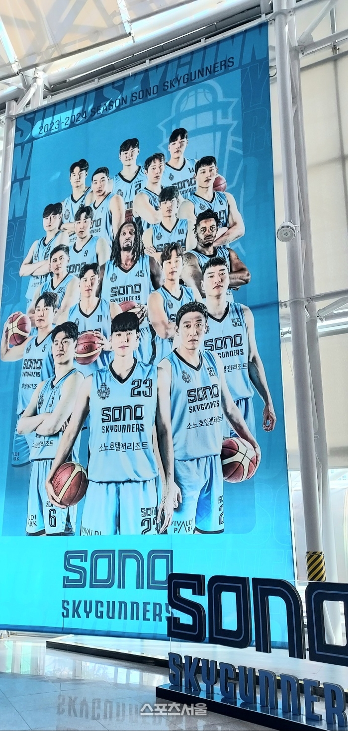 체육관 안으로 들어서자 소노 선수단의 모습이 담긴 대형 현수막이 눈에 들어왔다. 팬들이 줄을 서서 사진을 찍느라 분주했다. 경기장에 들어서자 소노 고유의 색인 스카이 블루로 가득했다. 소노는 수억 원을 들여 홈 코트를 리모델링했다. 예전 데이원의 산물인 주황색을 모조리 없앴다.