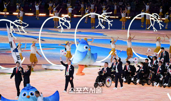 22일 항저우 올림픽 스포츠센터 스타디움에서 열린 2022 항저우 장애인아시아경기대회 개막식에서 대한민국 선수단이 입장하고 있다. 남자기수는 태권도 주정훈(절단장애)이며 여자기수는 골볼 김희진(약시)이다.