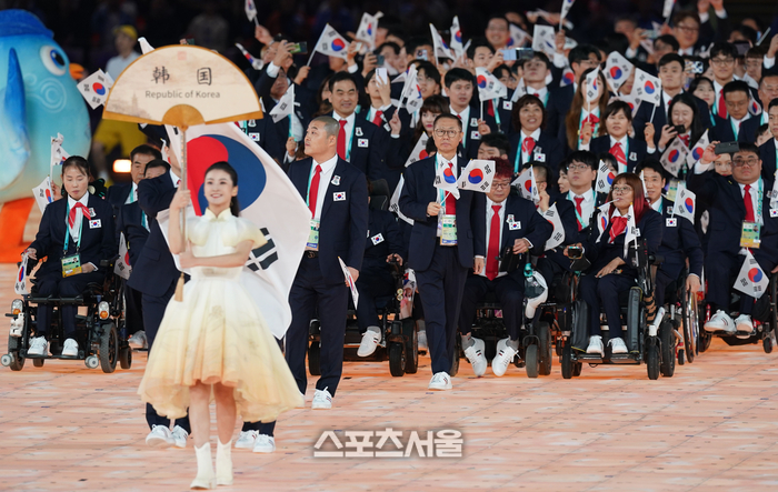 22일 항저우 올림픽 스포츠센터 스타디움에서 열린 2022 항저우 장애인아시아경기대회 개막식에서 대한민국 선수단이 입장하고 있다.