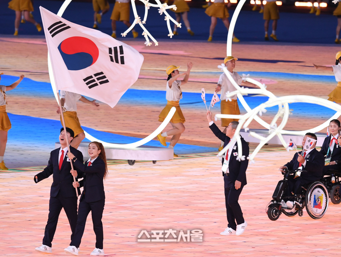 22일 항저우 올림픽 스포츠센터 스타디움에서 열린 2022 항저우 장애인아시아경기대회 개막식에서 대한민국 선수단이 입장하고 있다. 남자기수는 태권도 주정훈(절단장애)이며 여자기수는 골볼 김희진(약시)이다.