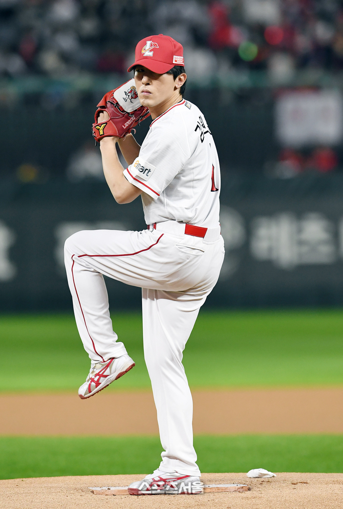 개그맨 김원훈이 23일 인천 SSG랜더스필드에서 열린 2023 KBO리그 SSG 랜더스와 NC 다이노스의 준플레이오프 2차전에 앞서 시구를 하고 있다. 2023. 10. 23. 문학 | 박진업기자 upandup@sportsseoul.com