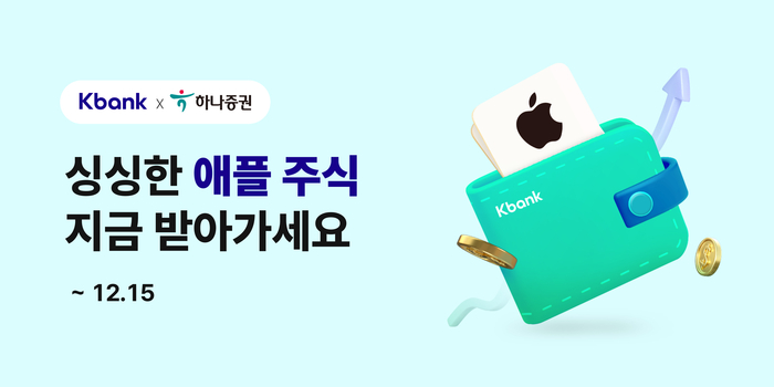 또 같은 기간 케이뱅크를 통해 생애 처음으로 하나증권 주식계좌(종합매매계좌)를 개설한 고객 중 추첨을 통해 100명에게 애플 주식 1주(약 24만원)를 증정한다. 두 가지 이벤트 모두 별도의 신청 절차가 없고 중복 참여도 가능하나, 참여를 위해서는 하나증권 선택 마케팅 동의 중 문자 수신 동의를 해야 한다.
