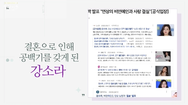 영상 속 강소라는 결혼 후 생긴 공백기를 언급했다. 그는 “조급했다. 왜냐면 이게 더 사라지고 없어지기 전에 뭔가를 더 빨리해야겠다. 공백기가 아무래도 처음으로 그렇게 3년 정도가 되다 보니까 두렵기도 했었다. 사람들이 나를 찾아줄까? 기억해 줄까? 고민이 컸던 것 같다”고 밝혔다.
