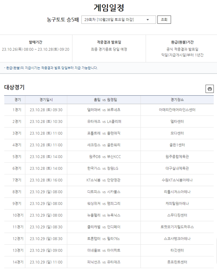 국민체육진흥공단이 발행하는 체육진흥투표권 스포츠토토의 수탁사업자 스포츠토토코리아가 오는 28일부터 29일까지 열리는 미국 프로농구(NBA) 11경기 및 국내 프로농구(KBL) 3경기 등 총 14경기를 대상으로 하는 농구토토 승5패 29회차 게임을 발매한다고 밝혔다.