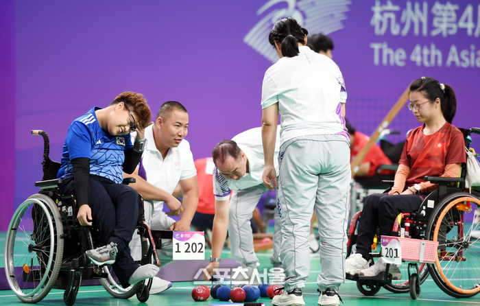 보치아 정소영이 25일 항저우 체육관에서 열린 2022 항저우 장애인아시아경기대회 여자 BC2 개인전 결승전에서 공위치를 확인하고 있다. 2023. 10. 25. 항저우(중국) | 최승섭기자 thunder@sportsseoul.com