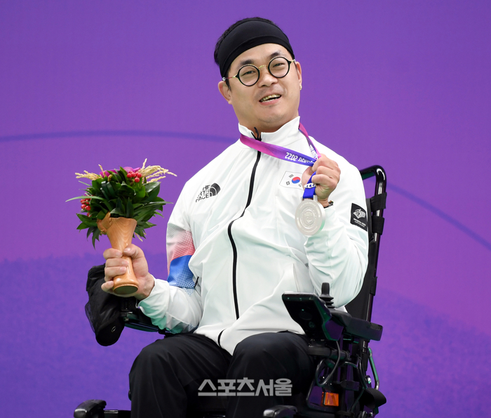 보치아 김도현이 25일 항저우 체육관에서 열린 2022 항저우 장애인아시아경기대회 BC1 개인전 은메달을 목에 건 후 포즈를 취하고 있다.