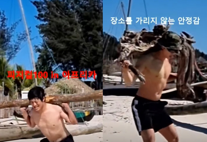 영상 속 기안84와 덱스는 마다가스카르 해변으로 보이는 곳에서 무거운 통나무를 들고 헬스에 몰입한 모습이다.