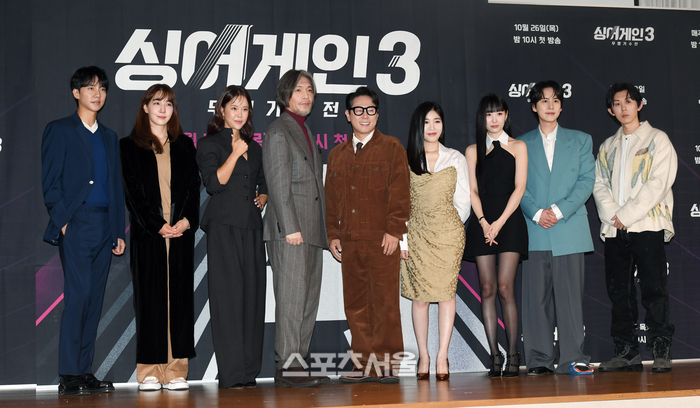 26일 서울 마포구 중소기업DMC타워에서 진행된 JTBC ‘싱어게인3-무명가수전’ 제작발표회에서 MC 이승기와 심사위원단이 취재진을 향해 포즈를 취하고 있다. 왼쪽부터 MC 이승기, 심사위원 작사가 김이나, 가수 백지영, 임재범, 윤종신, 이승기, 이해리, 선미, 규현, 코드 쿤스트. 2023. 10. 26. 박진업기자 upandup@sportsseoul.com