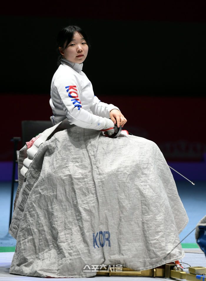 휠체어펜싱 조예진이 26일 항저우 전자과학기술대학 체육관에서 열린 2022 항저우 장애인아시아경기대회 여자 에페 단체 8강전에서 경기 후 장비를 벗고 있다.