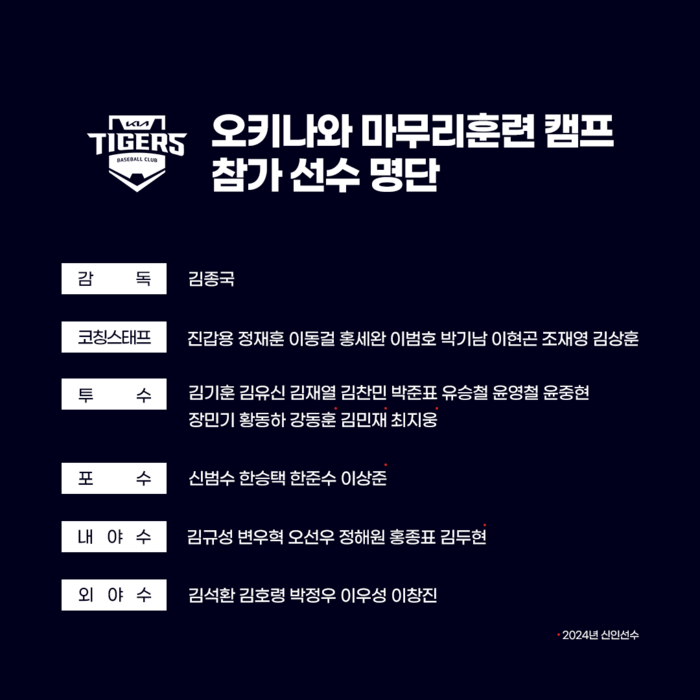 2024 1라운드 지명자인 투수 조대현(18)은 올해 많은 경기를 소화해, 선수 보호 차원에서 마무리 캠프에 참여하지 않는다. KIA 관계자는 26일 스포츠서울에 “부상이 있는 건 아니다. 그저 선수 보호 차원”이라고 설명했다.