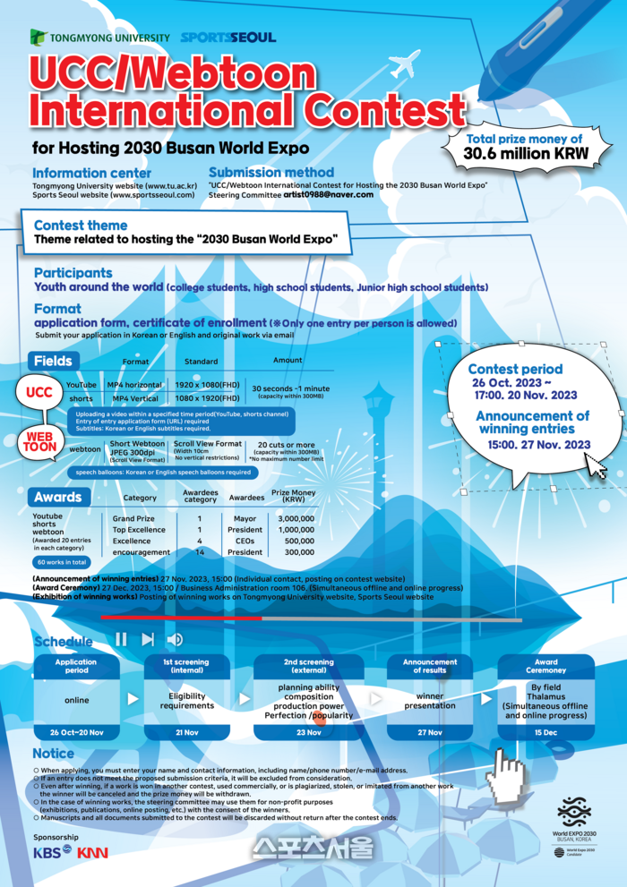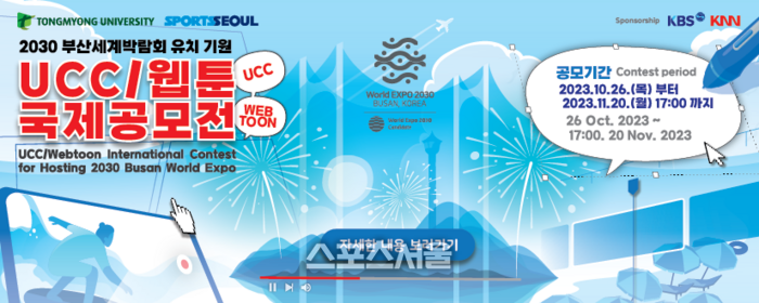 이번 공모전은 동명대학교와 스포츠서울이 주최하고 ‘2030 부산세계박람회 유치 기원 UCC·웹툰 국제공모전’ 운영위원회가 주관한다. 또 KBS와 KNN이 후원해 행사의 의미를 더할 전망이다.