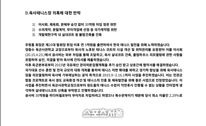 그는 당시 동생이 운영하는 미디어윌로부터 30억원을 차입해 육사코트 리모델링 사업을 벌였고, 이와 관련해 민원 등 논란이 일자 “미디어윌은 공익성을 고려해 협회에 피해가 가지 않도록 ‘기부채납이 종료될 때까지 원금 및 이자를 회수하지 못하도록 상환 요구나 민사상 책임을 지지 않고, 운영 수익금 내에서만 상환을 받는다’는 내용으로 미디어윌과 대한테니스협회 상호간의 협약서를 체결했다(2016.7.1)”고 설명했다.