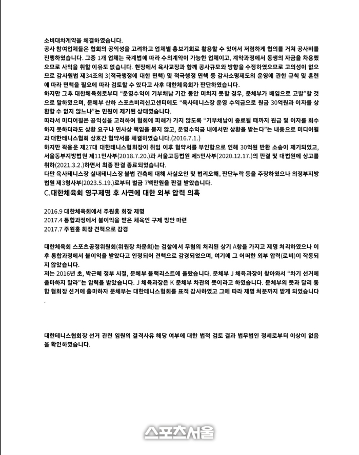 주 전 회장은 곽용운 27대 대한테니스협회 회장이 회장 재직시 자신을 검찰에 ‘특정경제범죄가중처벌에 관한 법률 위반(배임)’ 등 5가지 혐의로 고발했는데, 이 중 4가지는 이미 ‘무혐의 처벌’을 받은 것이라고 밝혔다.
