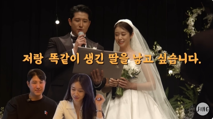 먼저 웨딩드레스를 입은 지연은 “저희를 닮은 예쁜 아이를 낳아 건강하고 올바르게 키우겠습니다”라고 혼인서약서를 읽었다. 이어 황재균은 “저랑 똑같이 생긴 딸을 낳고 싶습니다”라는 말로 하객들을 웅성거리게 만들었다.