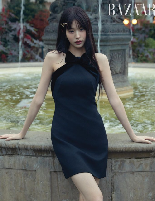 사진 속에서 장원영은 뱅헤어에 두개의 핀을 꽂은 채 나른한 표정을 짓고 있다. 홀터넥 드레스를 입은 장원영은 비스듬하게 분수대에 기댄 모습이다.