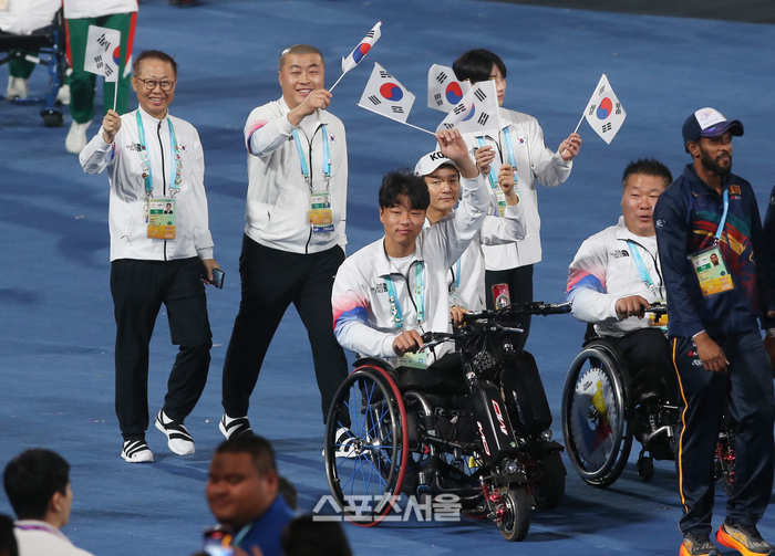28일 항저우 올림픽 스포츠센터 스타디움에서 열린 2022 항저우 장애인아시아경기대회 폐막식에서 한국선수단 대표들이 입장하고 있다.