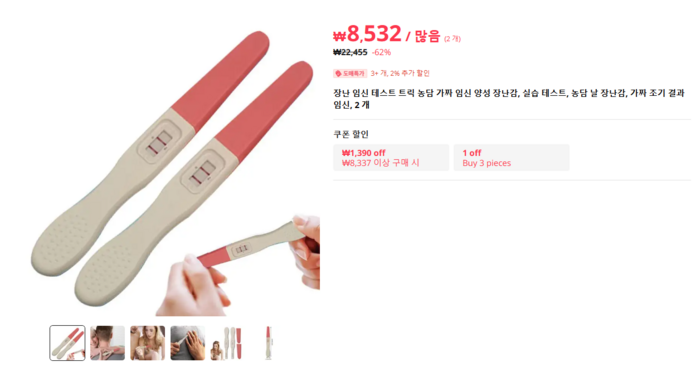 해당 제품은 2000원에서 8000원대 판매되며, 수돗물에 20초 동안 담그기만 하면 3~5분 사이에 두 줄이 나타나는 것으로 알려졌다.