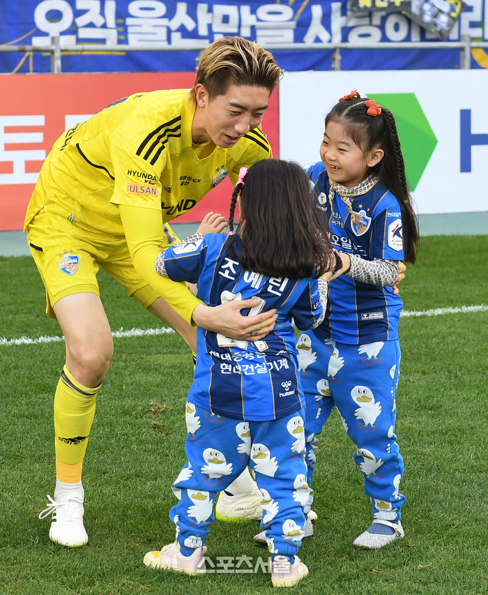 울산 현대 골키퍼 조현우가 29일 울산 문수축구경기장에서 열린 2023 K리그1 대구FC와 경기에서 2-0으로 승리하며 리그 2연패를 확정한 뒤 딸들과 기뻐하고 있다. 2023. 10. 29. 울산 | 박진업기자 upandup@sportsseoul.com