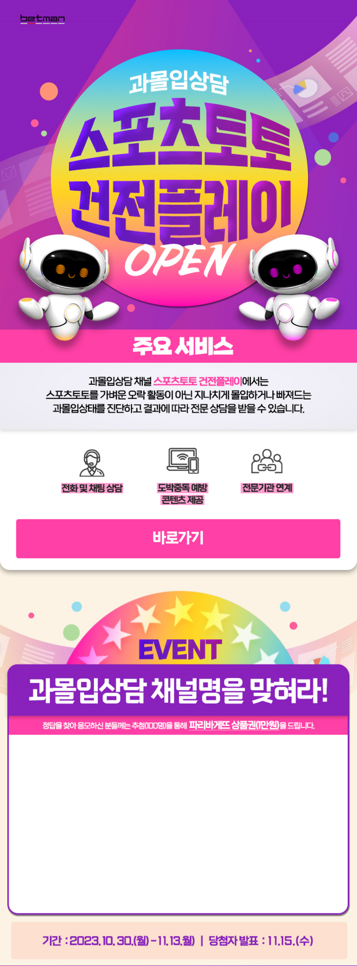 더불어 스포츠토토코리아는 ‘건전플레이’ 채널을 친구로 등록한 고객들을 대상으로 도박중독 예방 교육, 과몰입 방지, 불법스포츠도박 근절 관련 자료 등 계도 활동을 위한 다양한 콘텐츠도 주기적으로 발송할 예정이다. et16@sportsseoul.com