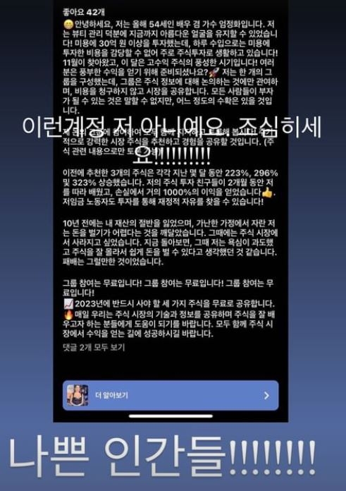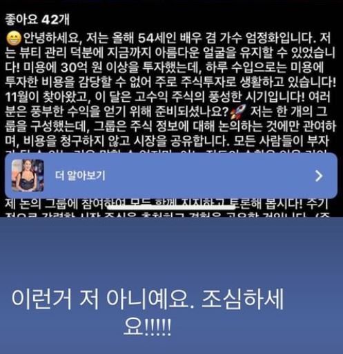 게시물에는 “저는 올해 54세인 배우 겸 가수 엄정화”라며 “저는 뷰티 관리 덕분에 지금까지 아름다운 얼굴을 유지할 수 있었다. 미용에 30억 원 이상을 투자했는데 하루 수입으로는 미용에 투자한 비용을 감당할 수 없어 주로 주식 투자로 생활하고 있다”라는 내용이 적혀 있다.