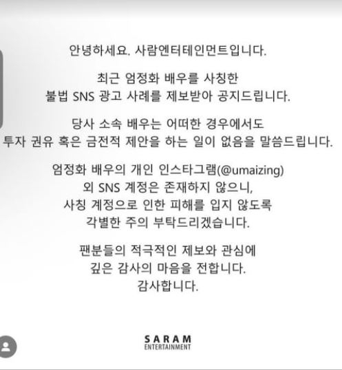 소속사 사람엔터테인먼트도 같은 날 공식 입장을 밝혔다. 사람엔터테인먼트는 “최근 엄정화 배우를 사칭한 불법 SNS 광고 사례를 제보받아 공지드립니다. 당사 소속 배우는 어떠한 경우에서도 투자 권유 혹은 금전적 제안을 하는 일이 없음을 말씀드립니다”라고 강조했다.