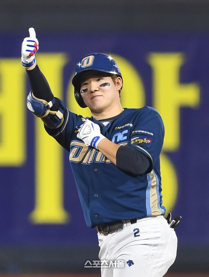 NC 박민우가 30일 수원 KT위즈파크에서 열린 2023 KBO리그 KT 위즈와 플레이오프 1차전 1회초 무사 1루 상황에서 KT 선발 쿠에바스를 상대로 2루타를 친 뒤 기뻐하고 있다. 2023. 10. 30. 수원 | 박진업기자 upandup@sportsseoul.com