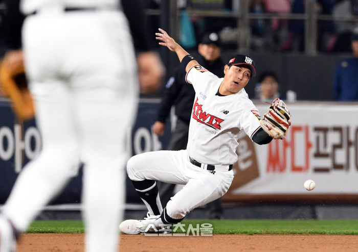 KT 위즈 3루수 황재균이 30일 수원 KT위즈파크에서 열린 2023 KBO리그 NC 다이노스와 플레이오프 1차전 3회초 무사 NC 박민우의 뜬공을 놓치고 있다. 2023. 10. 30. 수원 | 박진업기자 upandup@sportsseoul.com
