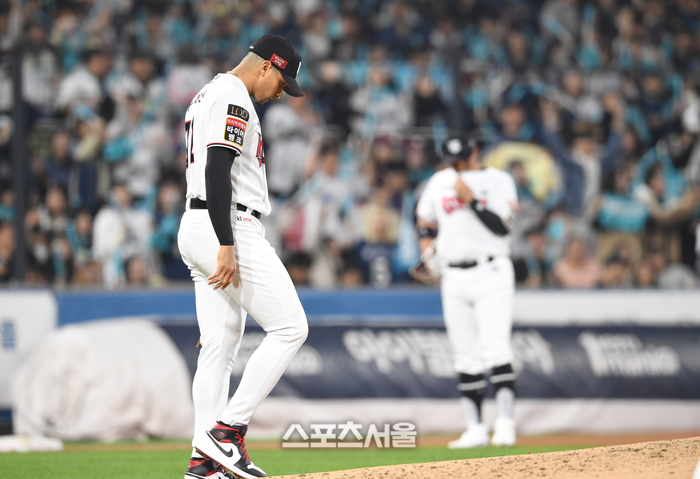 KT 위즈 선발투수 쿠에바스(왼쪽)가 30일 수원 KT위즈파크에서 열린 2023 KBO리그 NC 다이노스와 플레이오프 1차전 4회초 무사 1루 상황에서 NC 김주원의 번트 타구를 잡아 1루로 송구하는 과정에서 실책을 한 뒤 고개를 떨구고 있다. 오른쪽은 3회초 실책으로 실점의 빌미를 제공한 3루수 황재균. 2023. 10. 30. 수원 | 박진업기자 upandup@sportsseoul.com