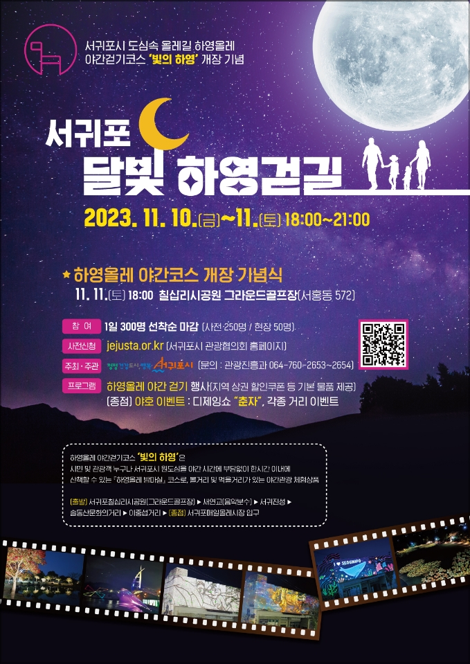[스포츠서울ㅣ김기원기자] 서귀포시는 시민 및 관광객 누구나 주‧야간 서귀포시 원도심을 즐길 수 있는 체류형 관광상품으로 하영올레 야간걷기코스(‘빛의 하영’)를 신규로 개설하고, 오는 11월 10일부터 11일 이틀에 걸쳐 개장 이벤트인 ‘서귀포 달빛 하영걷길’를 개최한다고 31일 밝혔다.