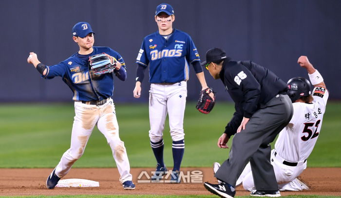 NC 유격수 김주원이 31일 수원KT위즈파크에서 열린 2023 프로야구 KT위즈와 NC다이노스의 플레이오프 2차전 7회말 1사 1,2루에서 장성우 투수앞 땅볼을 병살로 처리하고 있다. 2023.10.31. 수원 | 강영조기자 kanjo@sportsseoul.com