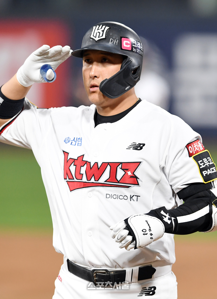 KT 위즈 황재균이 31일 수원 KT위즈파크에서 열린 2023 KBO리그 NC 다이노스와 플레이오프 2차전 8회말 2사 1루 상황에서 NC 이용찬을 상대로 안타를 치고 세리머니를 하고 있다. 2023. 10. 31. 수원 | 박진업기자 upandup@sportsseoul.com