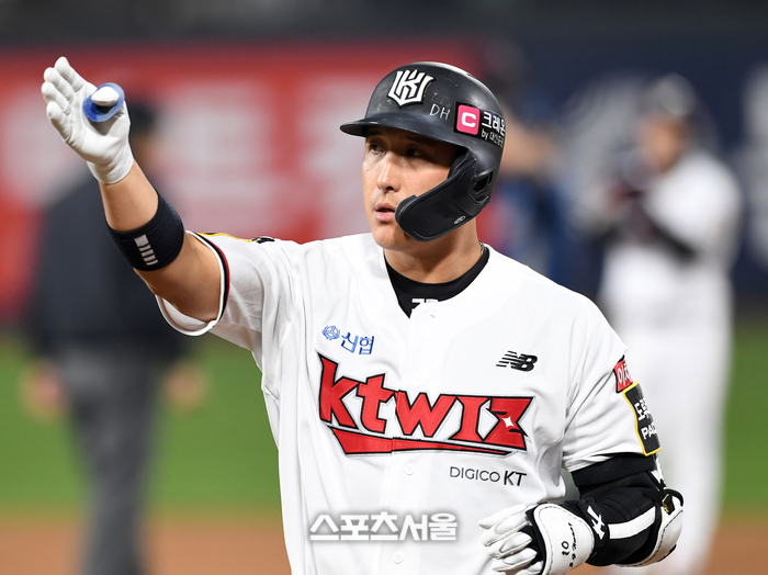 KT 위즈 황재균이 31일 수원 KT위즈파크에서 열린 2023 KBO리그 NC 다이노스와 플레이오프 2차전 8회말 2사 1루 상황에서 NC 이용찬을 상대로 안타를 치고 세리머니를 하고 있다. 2023. 10. 31. 수원 | 박진업기자 upandup@sportsseoul.com