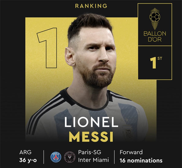 계속해서 라이벌로 꼽혔던 크리스티아누 호날두(5회·알 나스르)와 수상 격차도 3회로 벌렸다. 이른바 ‘GOAT’ 논쟁에 마침표를 찍은 셈이다. 호날두는 유럽이 아닌 사우디아라비아로 이적했는데, 발롱도르는 비유럽 리그에서 활약을 높게 평가하지 않는다. 그렇기에 호날두가 발롱도르를 다시 받는 건 사실상 어렵다. 향후 어떤 선수도 메시의 기록을 넘볼 수 없을 가능성이 크다.