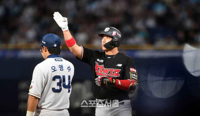 KT 2번타자 황재균이 2일 창원NC파크에서 열린 2023 프로야구 KT위즈와 NC다이노스의 플레이오프 3차전 1회초 무사 1루에서 안타로 출루하고 있다. . 2023.11.02. 창원 | 강영조기자 kanjo@sportsseoul.com