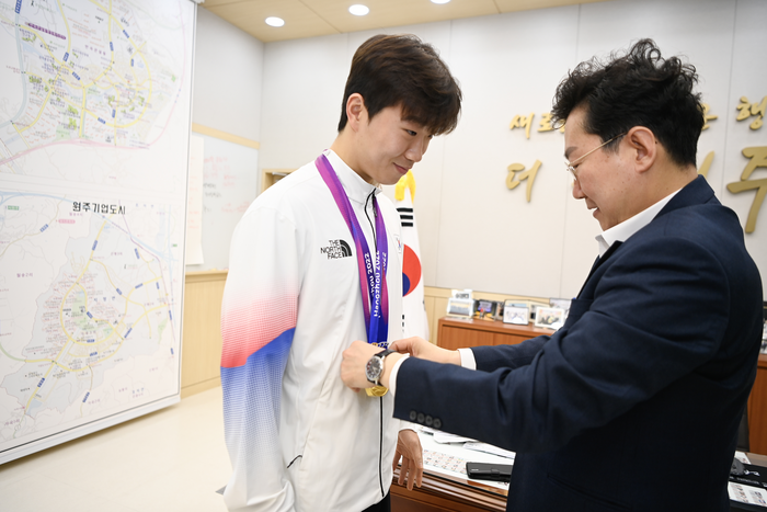 전국 | 강원 [포토]원강수 원주시장, 박우혁 항저우 아시안게임 태권도 금메달리스트 접견 입력2023-11-03 19:37:42 북마크 페이스북 트위터 SNS 더보기 가글자크기설정 인쇄 SNS 더보기 닫기 네이버밴드 네이버블로그 URL복사 글자크기 설정 메뉴 닫기 글자크기 설정 시 다른 기사의 본문도동일하게 적용됩니다. 가 가 가 가 가 [스포츠서울ㅣ원주=김기원기자] 원강수 원주시장은 지난 1일 청사를 방문한 박우혁 항저우 아시안게임 태권도 금메달리스트와 차담을 했다.acdcok4021@sportsseoul.com 기사추천 0