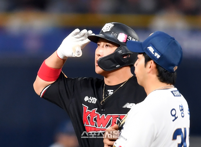 KT 2번타자 황재균이 3일 창원NC파크에서 열린 2023 프로야구 KT위즈와 NC다이노스의 플레이오프 4차전 2회초 1사 1,3루에서 1타점 2루타로 출루하고 있다. 2023.11.03.