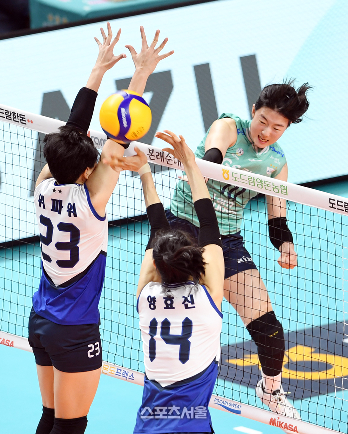 GS칼텍스 강소휘(오른쪽)가 3일 장충체육관에서 열린 2023-2024 V리그 여자부 현대건설과 경기에서 스파이크 공격을 하고 있다. 2023. 11. 3. 장충 | 박진업기자 upandup@sportsseoul.com
