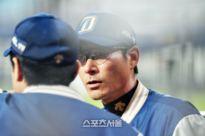 NC 강인권 감독이 3일 창원NC파크에서 열린 2023 프로야구 KT위즈와 NC다이노스의 플레이오프 4차전 경기막판 김수경투수코치와 진지한 대화를 나누고 있다.2023.11.03.