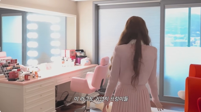 커다란 화장대가 있는 메이크업룸은 온통 핑크색 제품이 가득했다. 프리지아는 “(메이크업) 샵 의자처럼 하고 싶어서 진짜 샵에서 쓰는 의자를 핑크로 덮어가지고 제작하고. 화장대도 제작했다”고 소개했다.