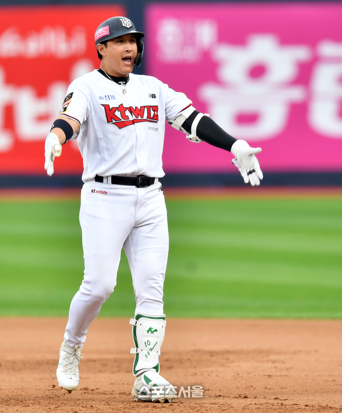 KT 2번타자 황재균이 5일 수원KT위즈파크에서 열린 2023 프로야구 KT위즈와 NC다이노스의 플레이오프 5차전 6회말 무사 1루에서 안타로 출루하고 있다. 2023.11.05. 마산 | 강영조기자 kanjo@sportsseoul.com