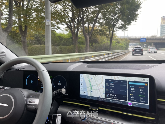 실내에는 가로로 넓게 배치된 12.3인치 돌출형 디스플레이가 눈에 들어온다. 전기차로 넘어오면서부터 디스플레이에 배치된 ‘EV 메뉴’가 중요하다. 배터리 잔량과 주변 충전소, 주요 부분의 전력 소비량, 배터리 컨디셔닝 모드, 스마트 회생 제동 등 전기차의 정보를 세세하게 볼 수 있다는 점이 돋보인다. ‘시네마 메뉴’에선 왓차, 웨이브를 볼 수도 있다. 최근 현대차가 유튜브를 탑재하겠다는 계획도 밝힌 만큼 이에 대한 확장성도 기대된다.