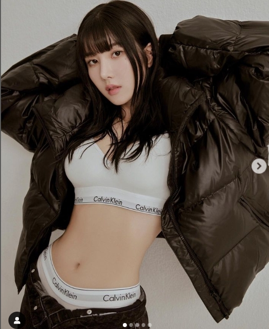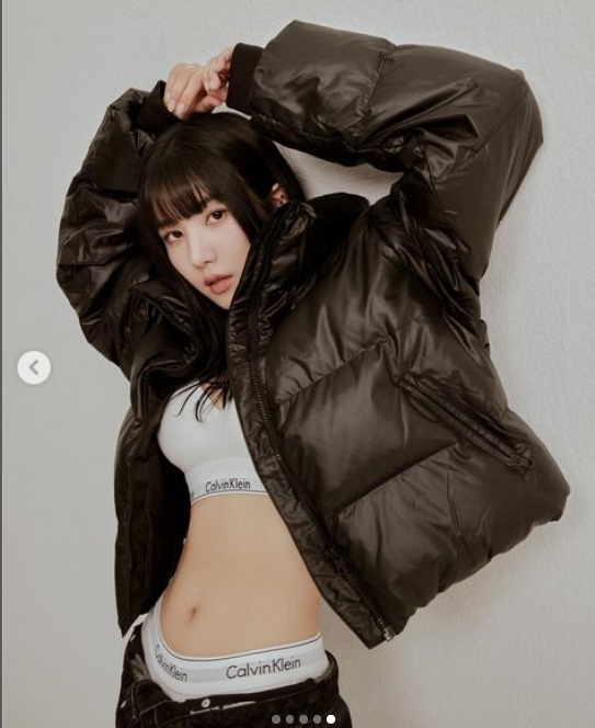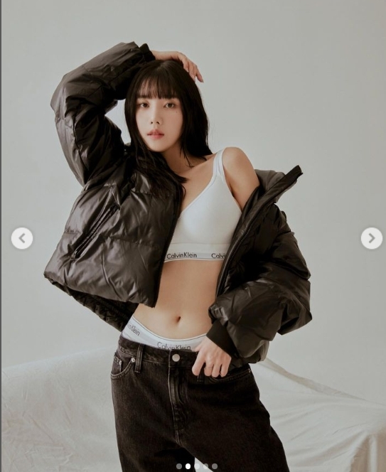 화이트 브라톱에 패딩을 매치해 탄탄하고 잘록한 허리 라인을 강조했다. 고혹한 눈빛이 더해져 매력을 발산하고 있다.