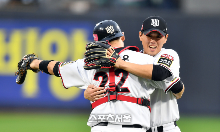 마무리 김재윤과 KT선수들이 5일 수원KT위즈파크에서 열린 2023 프로야구 KT위즈와 NC다이노스의 플레이오프 5차전에서 1점차로 승리, 한국시리즈 진출을 확정하며 자축하고 있다. 2023.11.05. 마산 | 강영조기자 kanjo@sportsseoul.com