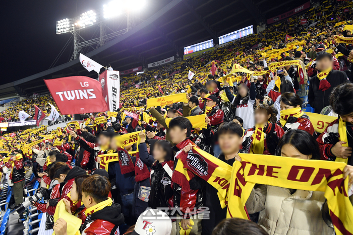 7일 잠실구장에서 2023 KBO리그 LG 트윈스와 KT 위즈의 한국시리즈 1차전이 열린 가운데 LG 팬들이 응원을 펼치고 있다. 2023. 11. 7. 잠실 | 박진업기자 upandup@sportsseoul.com