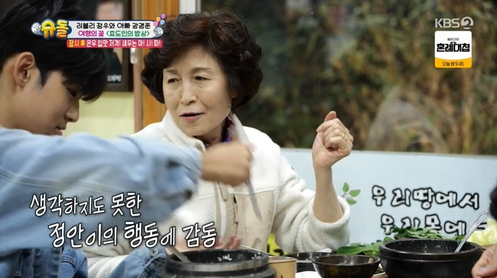 7일 방송된 KBS2 ‘슈퍼맨이 돌아왔다’에는 ‘함께라서 500배 행복해’ 편으로 강경준, 정안, 정우 삼부자와 강경준의 어머니가 함께 여행을 떠난 모습이 그려졌다.