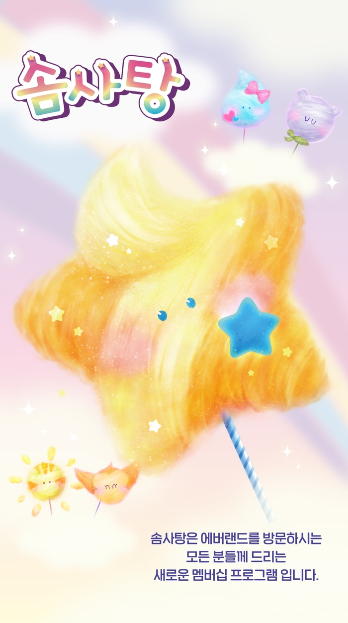 솜사탕은 에버랜드, 캐리비안 베이, 홈브리지 등 에버랜드 리조트를 이용하면서 누릴 수 있는 통합 멤버십 제도다. 동심의 세계로 돌아가 달콤하고 행복한 순간을 선물한다는 의미를 담았다. 솜(포인트) 적립, 토핑(쿠폰) 증정, 스페셜 체험 참여 기회 등 누구나 다양한 이용 혜택을 받을 수 있다.