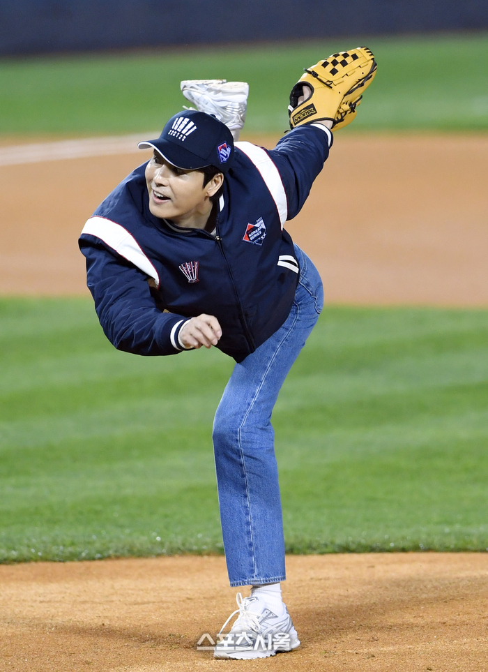 배우 정우성이 8일 잠실구장에서 열린 2023 KBO리그 LG 트윈스와 KT 위즈의 한국시리즈 2차전에 앞서 시구를 하고 있다. 2023. 11. 8. 잠실 | 박진업기자 upandup@sportsseoul.com