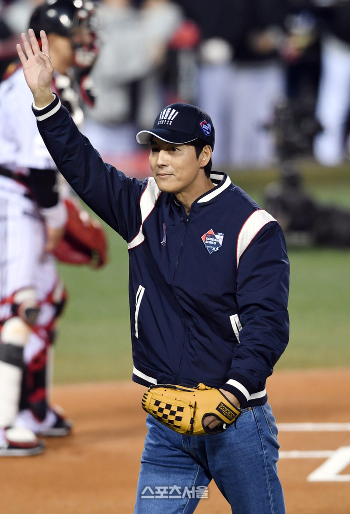 배우 정우성이 8일 잠실구장에서 열린 2023 KBO리그 LG 트윈스와 KT 위즈의 한국시리즈 2차전에 앞서 시구를 한 뒤 관중석을 향해 인사를 하고 있다. 2023. 11. 8. 잠실 | 박진업기자 upandup@sportsseoul.com